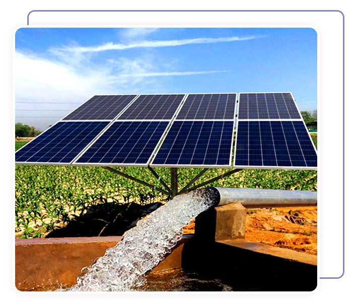 The photovoltaic cells in solar modules convert sunlight into Direct Current (DC) electrical energy. This DC energy is then fed to the Motor Pump Set via Pump Controller in case of DC pump or via Variable Frequency Drive (VFD) in case of AC pumps (VFD controls speed of Motor). The Pumping system is a combination of an impeller and a motor: the impeller propels water movement and the motor drives the pump. The water is propelled out of the bore well/river/lake/pond through the pipe so that water can then be fed to the fields for irrigation and other purposes. Water output varies during the day depending upon varying solar irradiance.